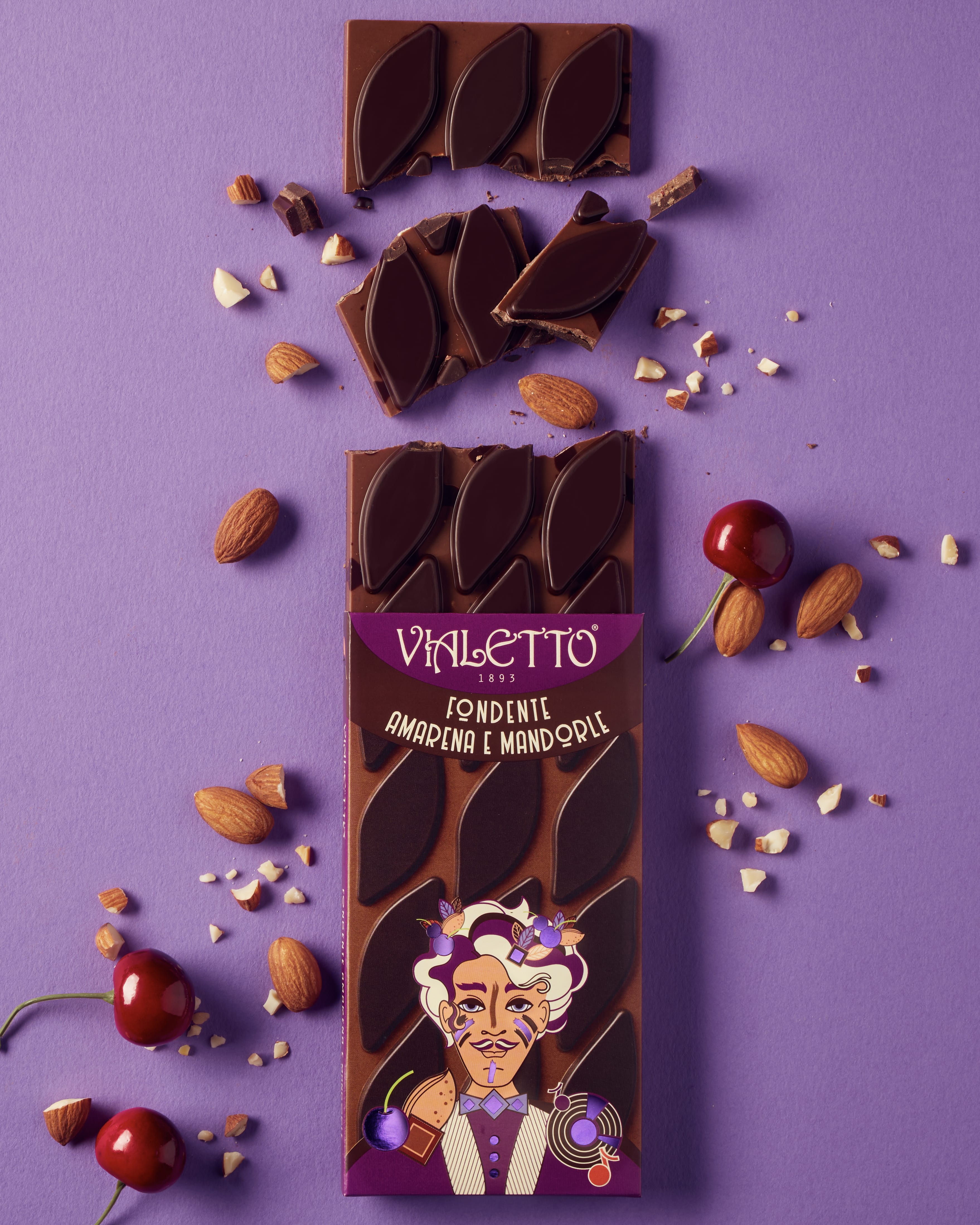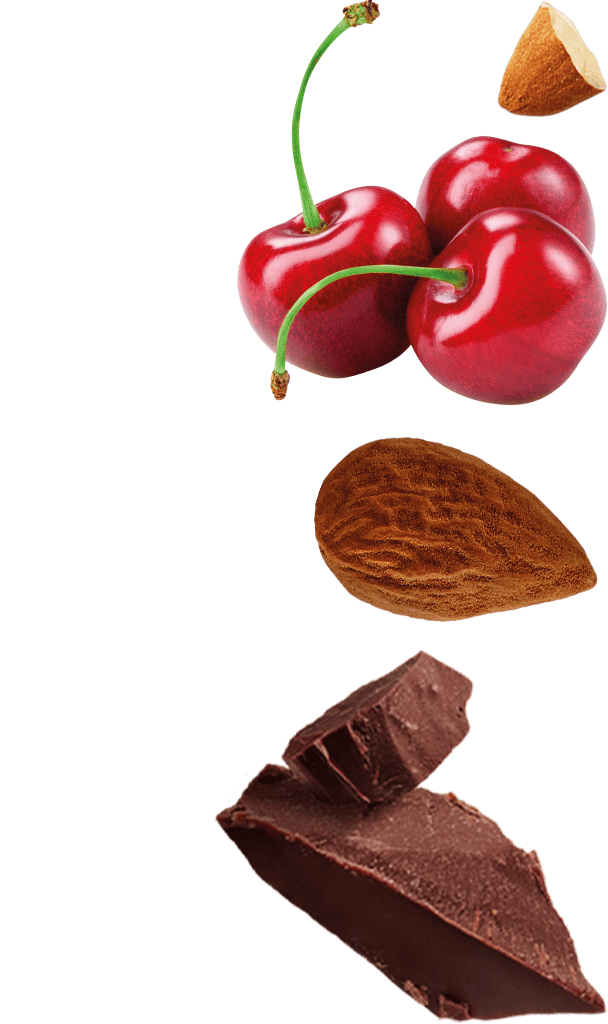 Le note intense del cioccolato fondente 72% bilanciate da uno strato centrale di cremoso gianduia con amarena in pezzi e mandorle caramellate per un gusto deciso ed extragoloso.
